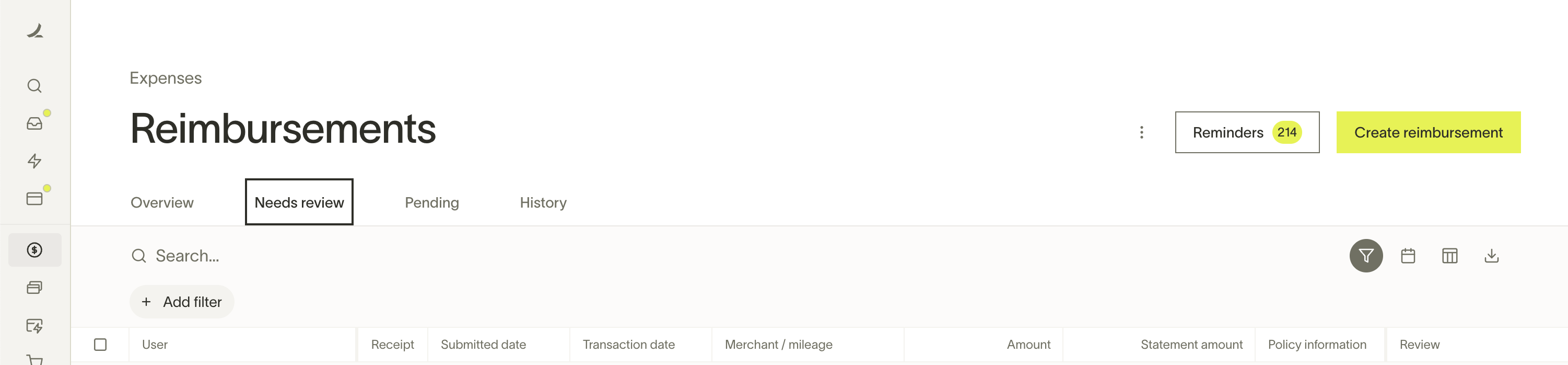 Once employees submit their reimbursements, they will appear in the Pending or Needs Review tab under Expenses > Reimbursements.