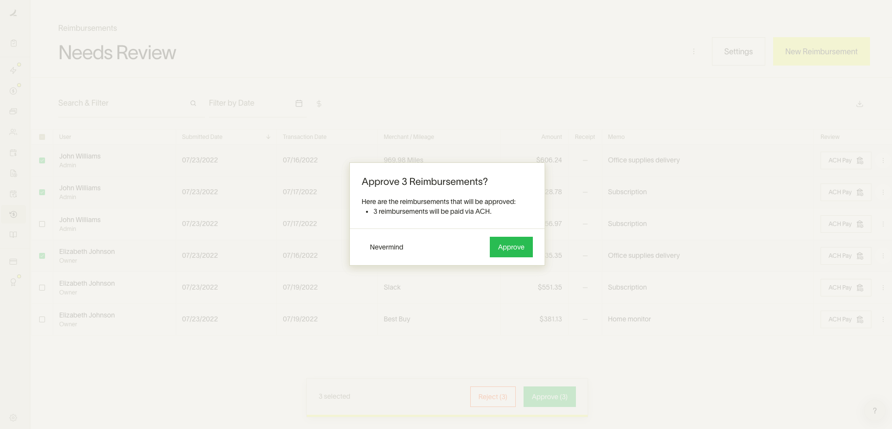 Admins and managers may approve reimbursements in bulk by selecting the check boxes next to each reimbursement. After clicking "Approve," you'll be prompted to confirm your selection.